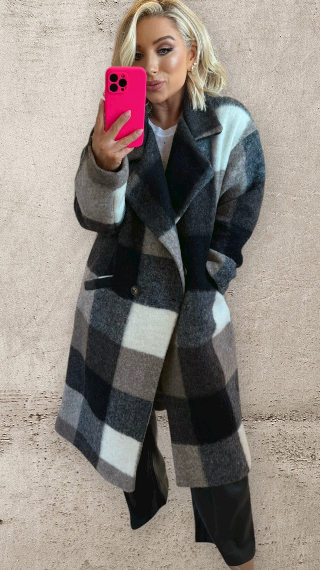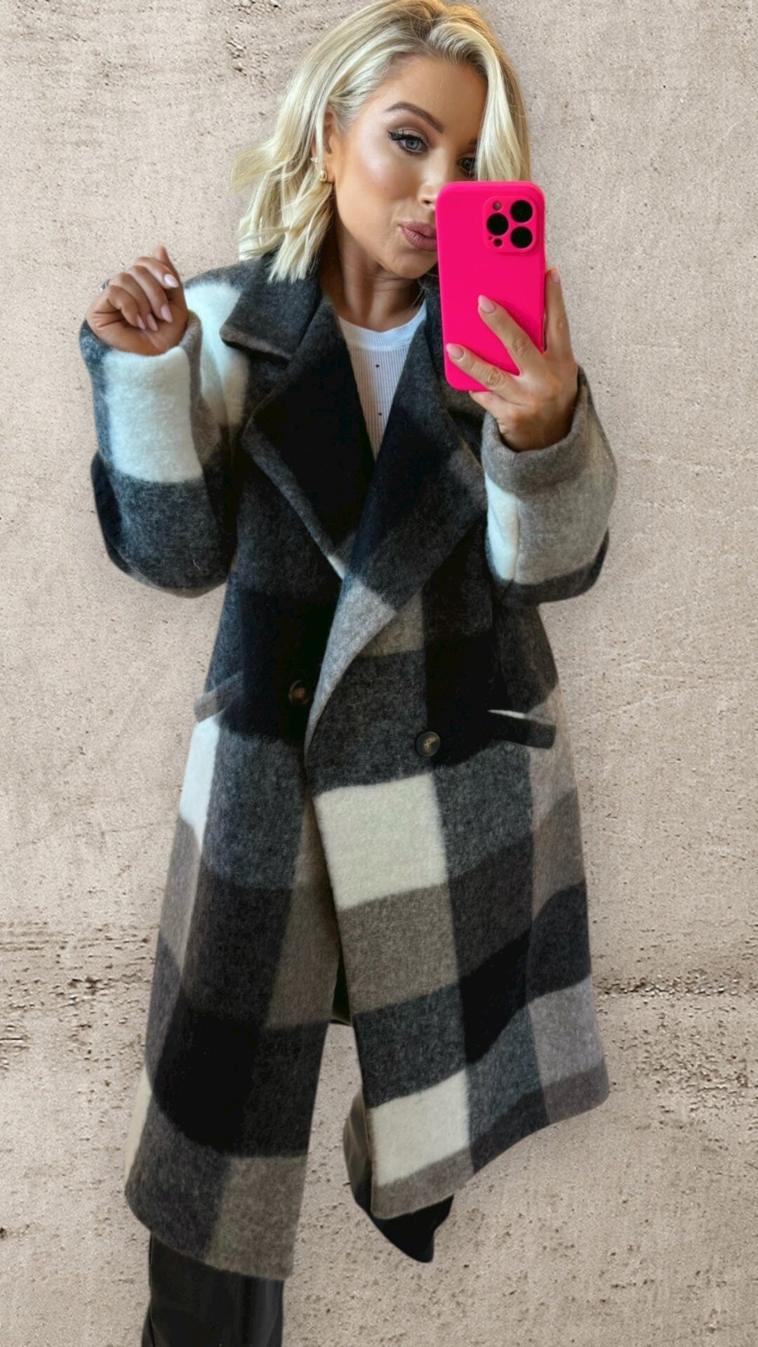 Meet The Valencia Coat — a chic showstopper in a sumptuous 70% wool blend. Super soft, fully lined, and effortlessly chic, it’s the ultimate statement layer for cold-weather days. The bold oversized check in black, cream & grey tones exudes confidence and warmth, while the relaxed silhouette and double-breasted design keep it timeless and flattering.