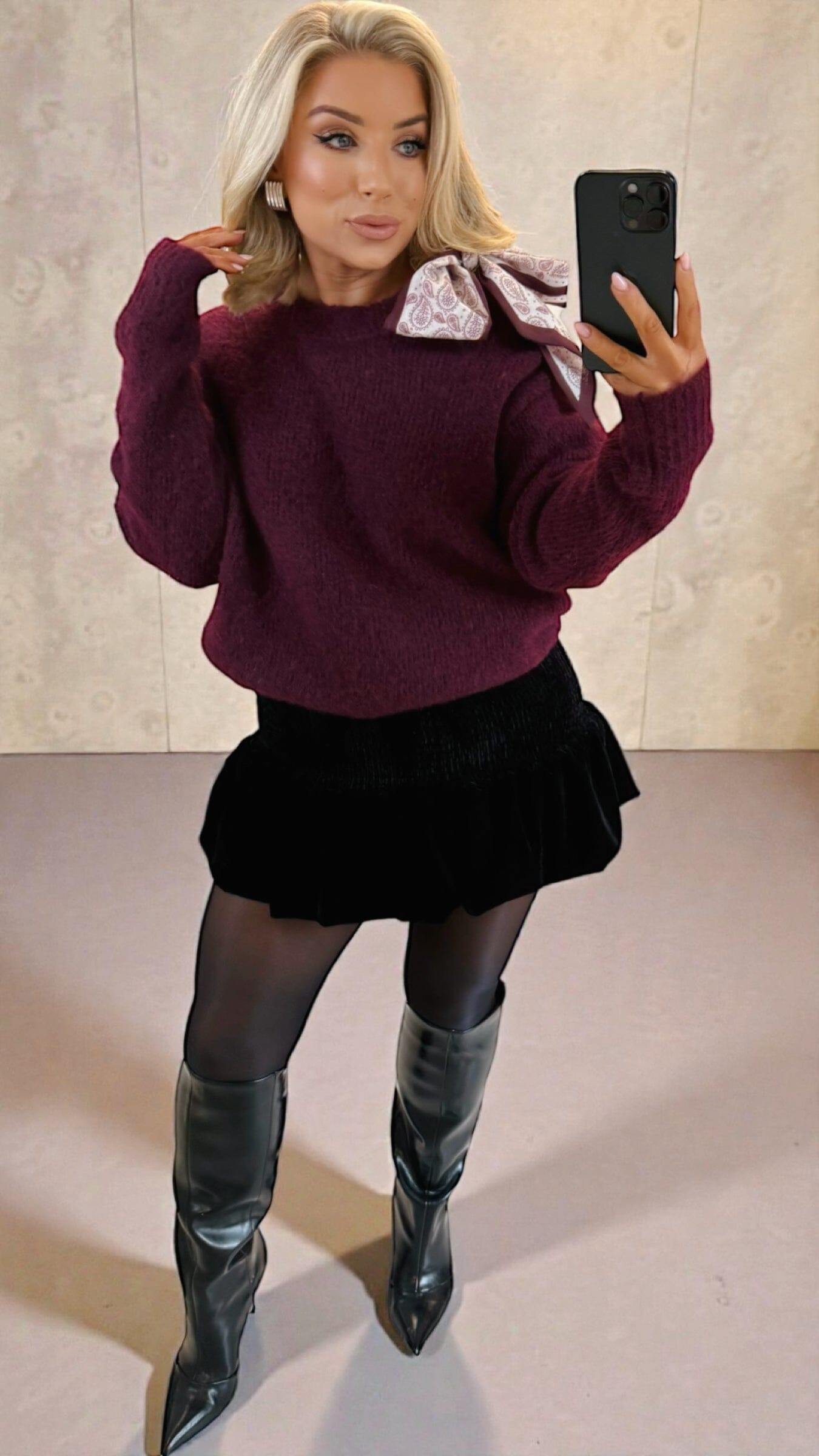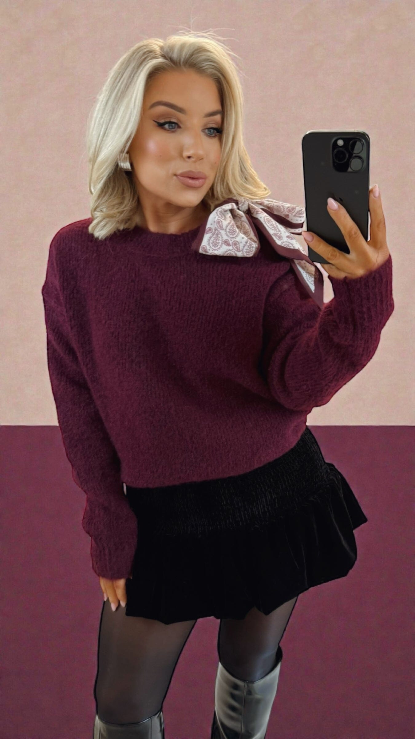 Meet The Bordeaux Bow Knit — your rich, romantic winter knit with the standout detail of the season. In a deep, luxurious burgundy, this cosy, warm, ultra-soft piece features a statement shoulder tie in an ivory-and-burgundy paisley print that adds instant elegance.
