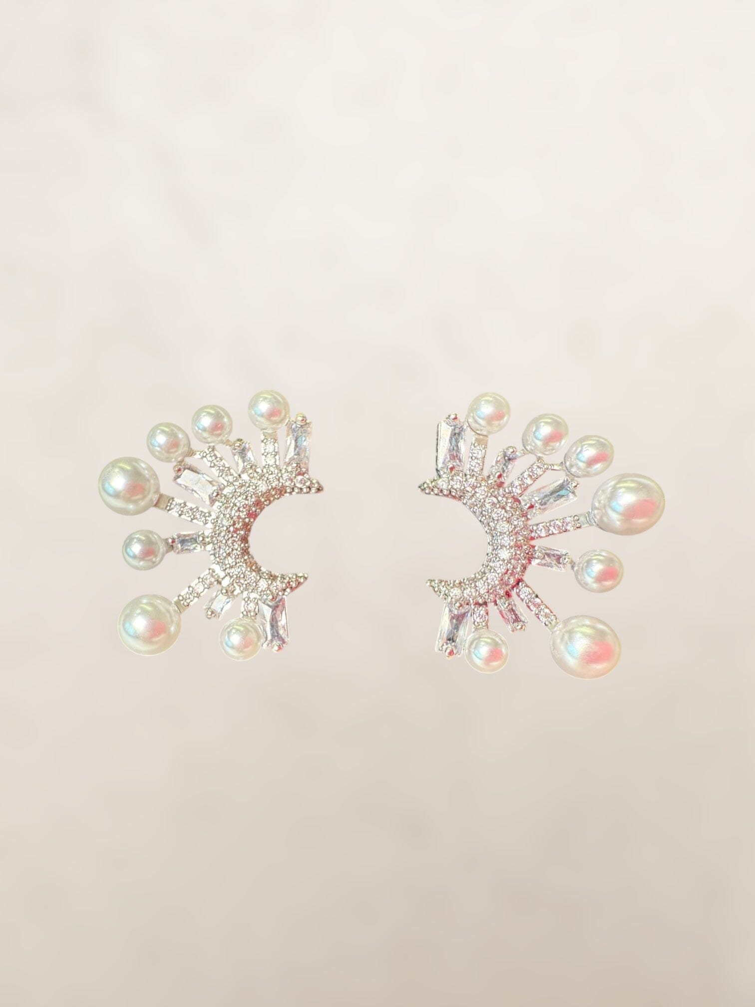 |Celestial glamour meets couture-level sparkle in The Lunar Pearl Radiance Earrings — a breathtaking statement piece crafted with premium Austrian crystals and luminous pearls. Designed in a striking crescent silhouette with starburst baguette stones and floating pearls, these earrings are made to steal the spotlight from every angle.