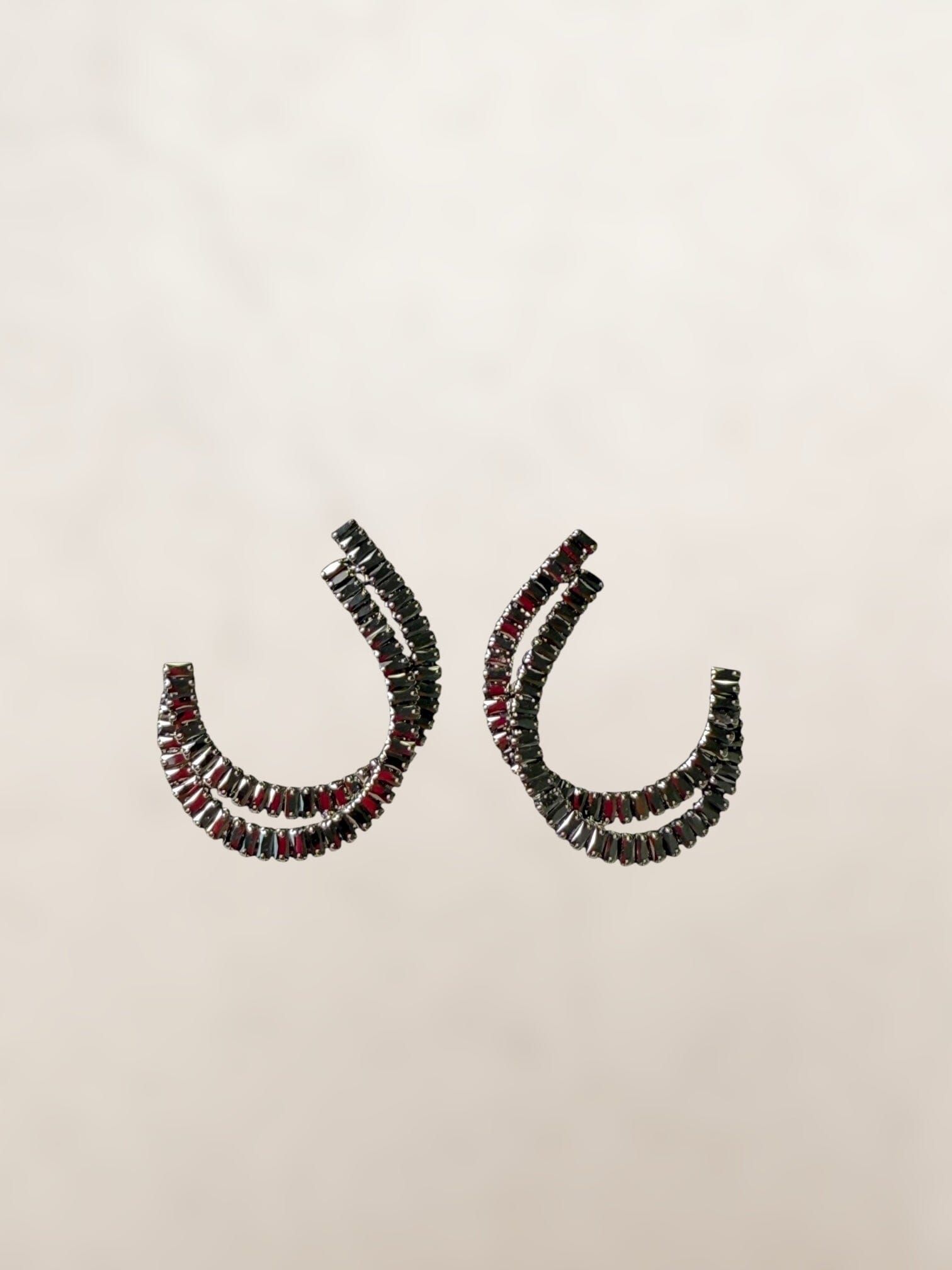 Edgy, modern and made to turn heads — The Noir Rouge Hoops are your new going-out earrings with a luxe twist. Designed with a striking double arc of jet-black and garnet-red baguette crystals, they bring depth, drama, and instant cool-girl energy to any outfit.