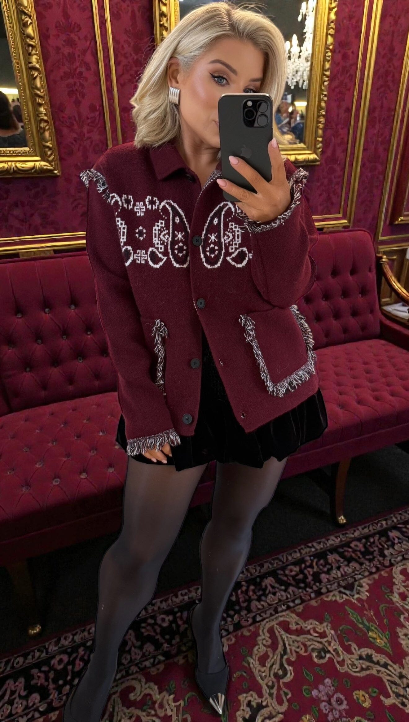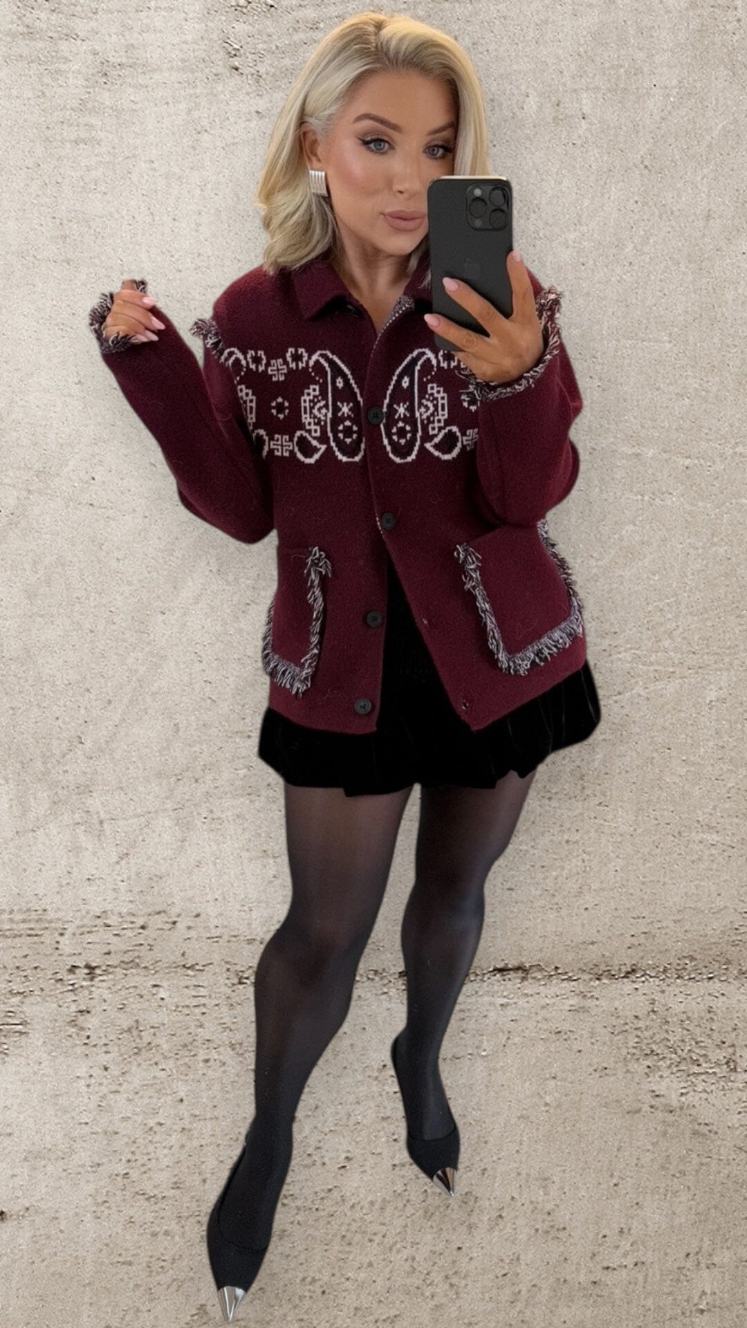 Turn heads in The Bandana Luxe Jacket – a luxury knit in a chic burgundy.