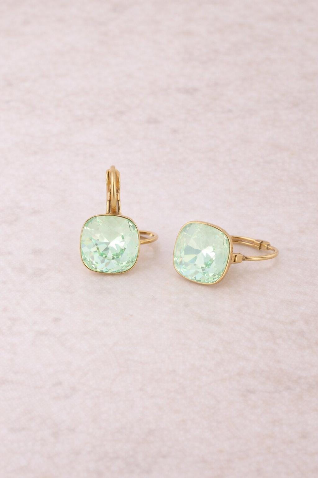 |Radiant and unmistakably elegant, the AYLA crystal earrings are designed to make a statement. Featuring a vibrant mint green cushion-cut crystal set in polished gold tone, these luxury crystal earrings capture the light beautifully, adding elegance to any look. Perfect for both daytime elegance and evening glamour, the ayla earrings are ideal for those who love modern luxury accessories.