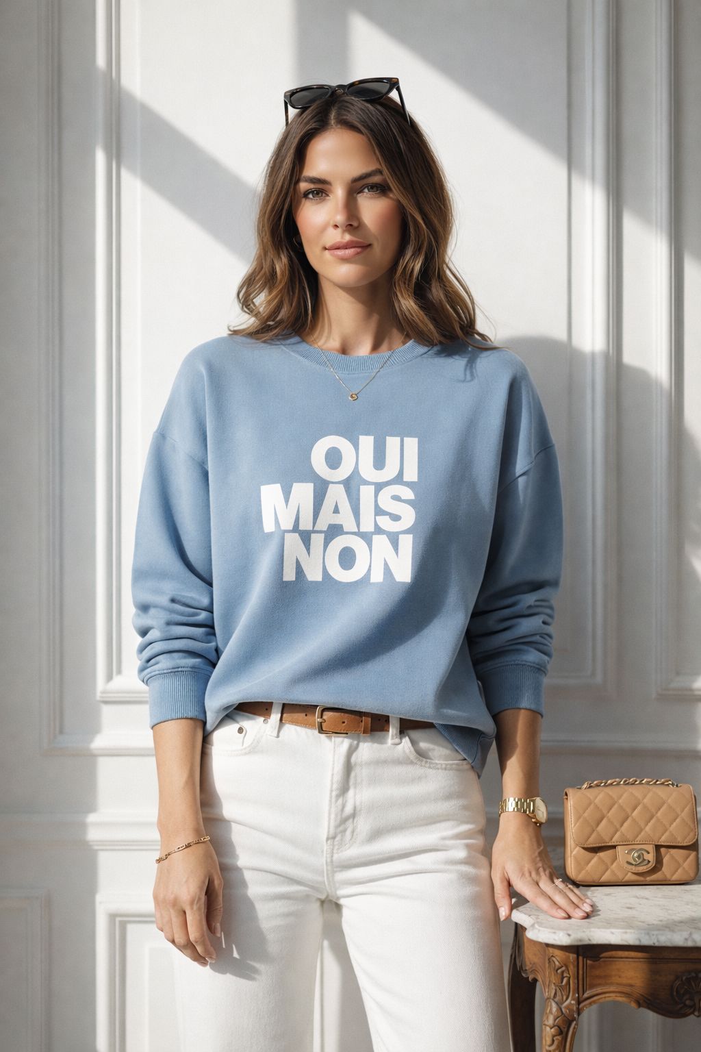 Meet your new off-duty essential: The Oui Mais Non Sweatshirt — where effortless Parisian attitude meets ultra-soft lounge luxury.