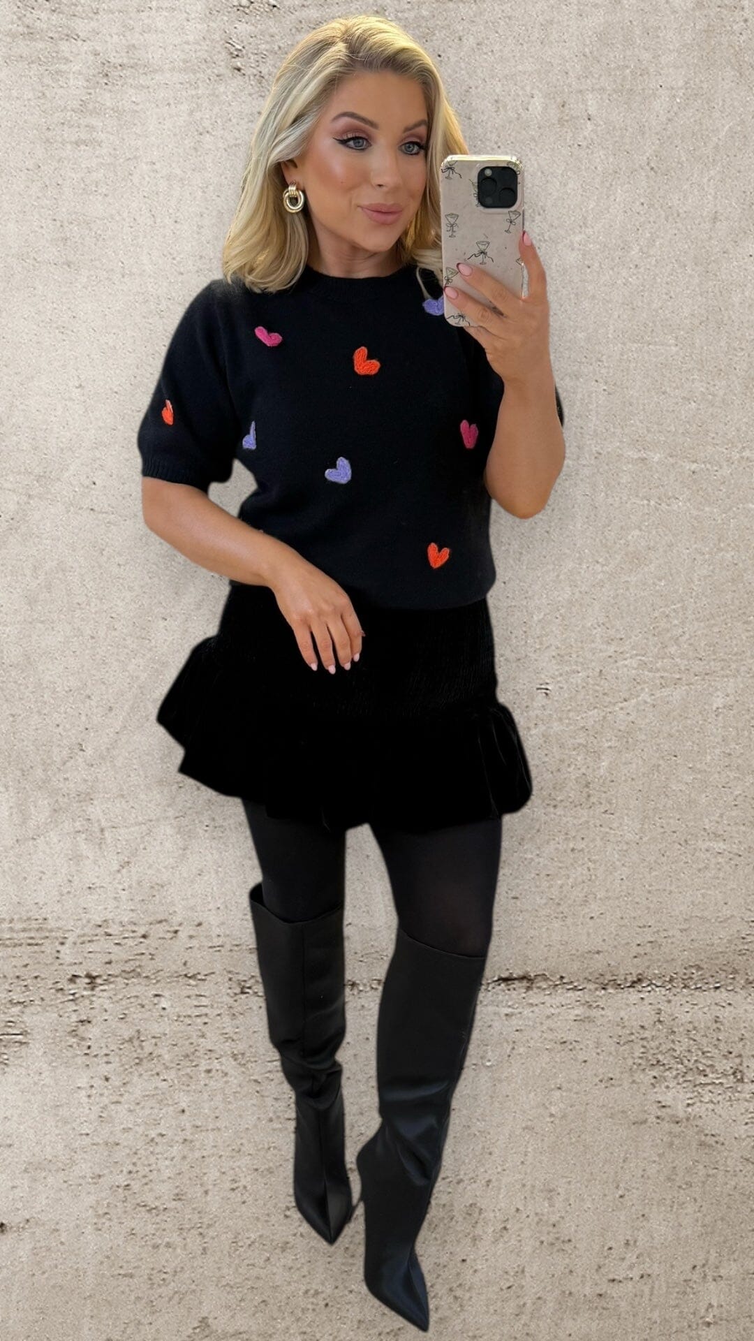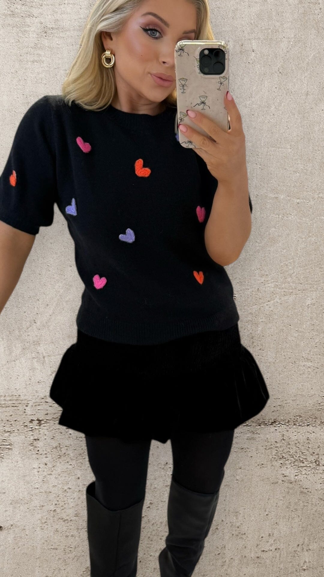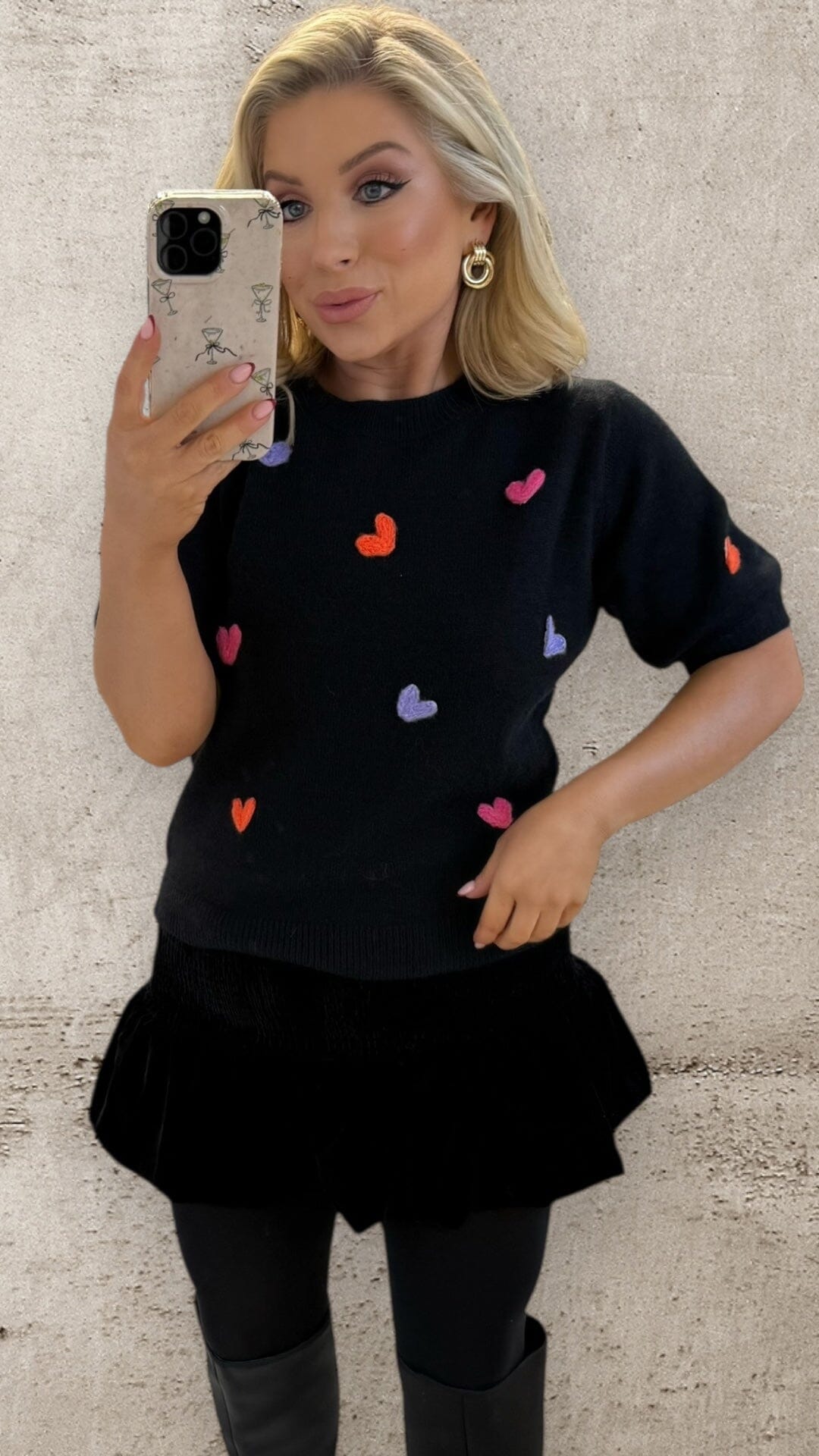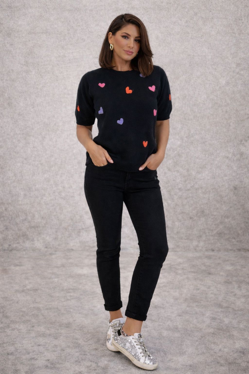 Meet The Amore Knit — the effortless feel-good knit your wardrobe didn’t know it needed. Crafted in a soft, lightweight knit with a relaxed silhouette, this black short-sleeve piece is elevated with delicately embroidered colourful heart motifs for a subtle pop of personality.