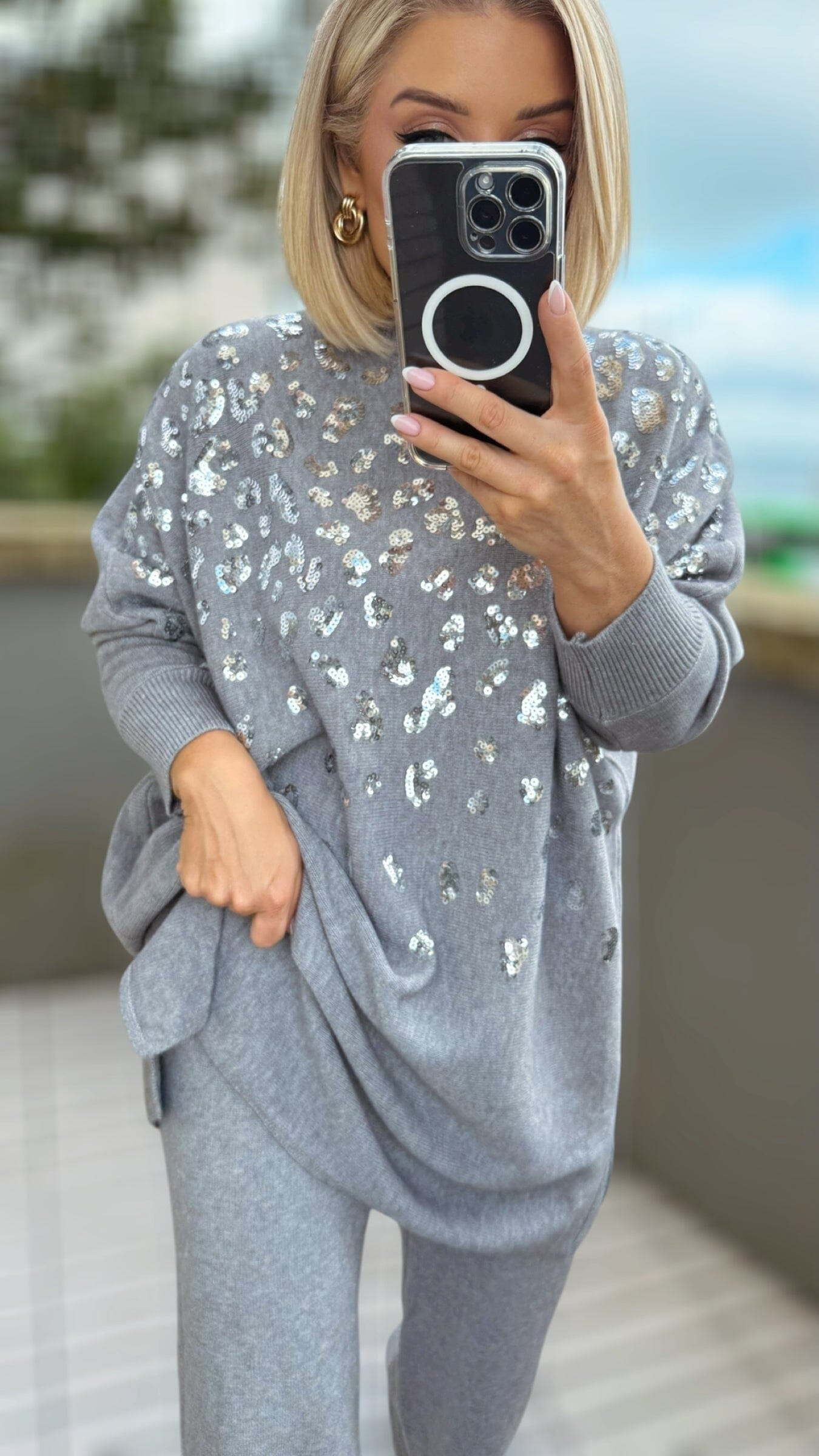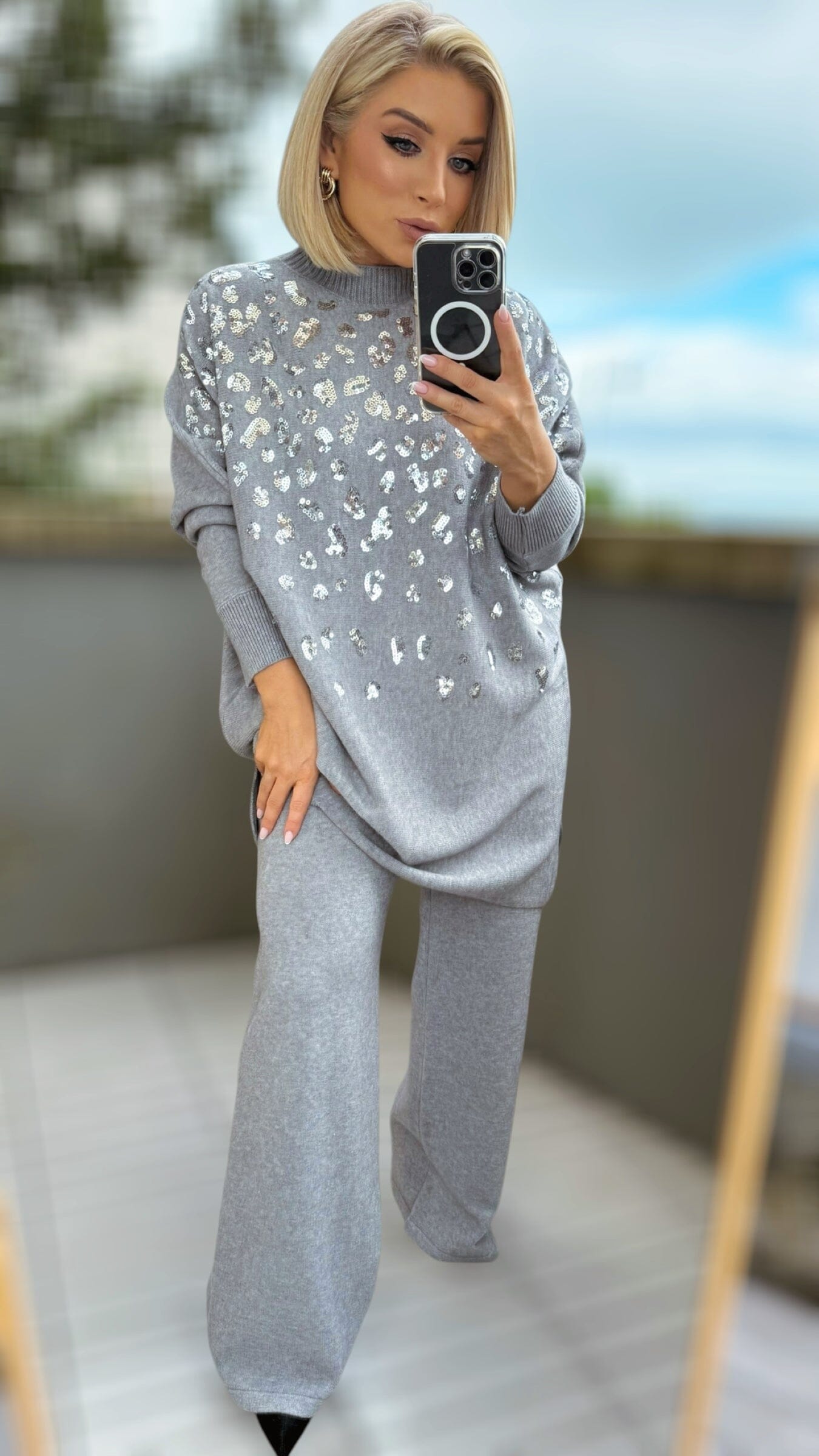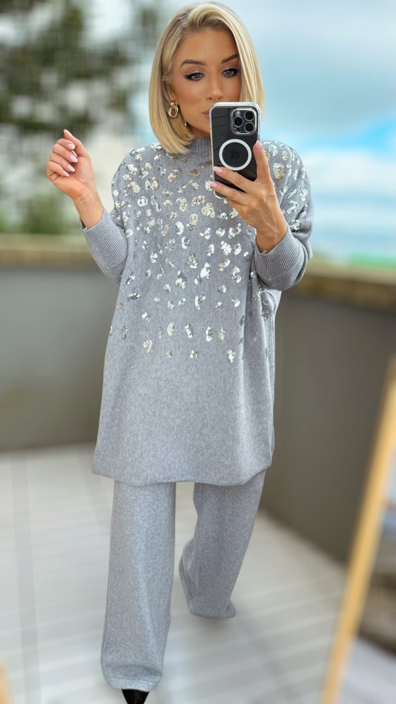 |Elevate your everyday style with The Luxe Leopard Co-ord, a super-soft grey marl two-piece designed for ultimate comfort and effortless glamour. The relaxed-fit top shimmers with a delicate silver sequin leopard print, perfectly paired with wide-leg palazzo trousers featuring a flattering stretch waistband.