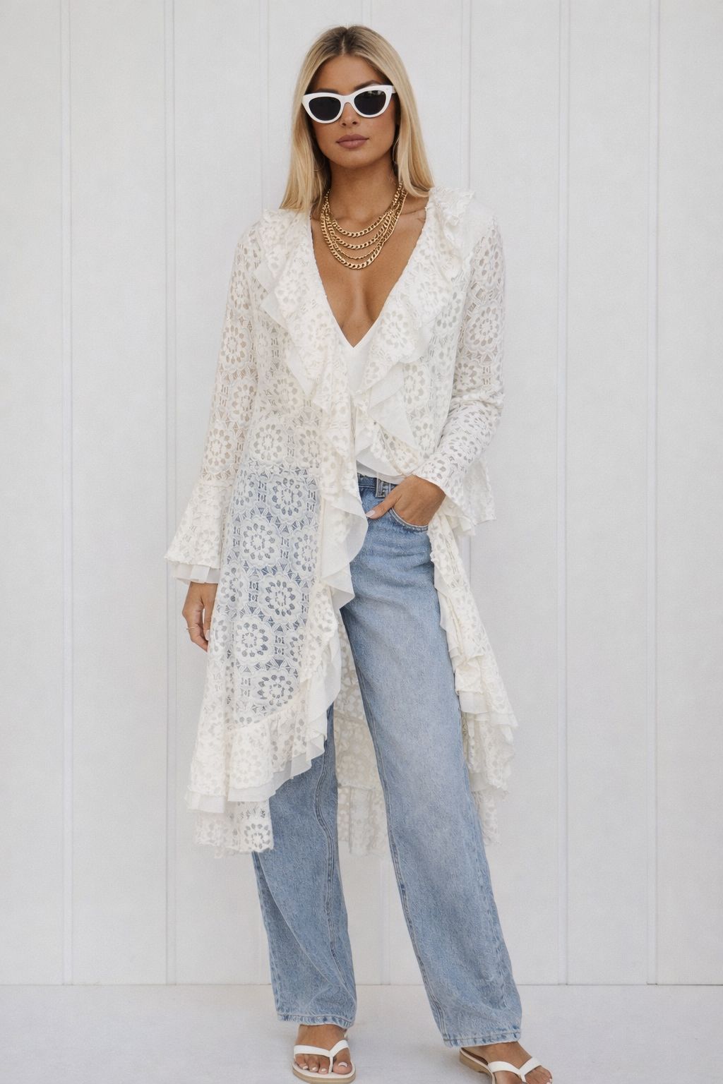 Crafted in a soft ivory lace with intricate floral detailing throughout, this lightweight kimono drapes beautifully over the body for that relaxed yet elevated silhouette. The cascading ruffle trim and soft layered edges add movement and femininity, while the longer length gives it that luxe, statement feel.