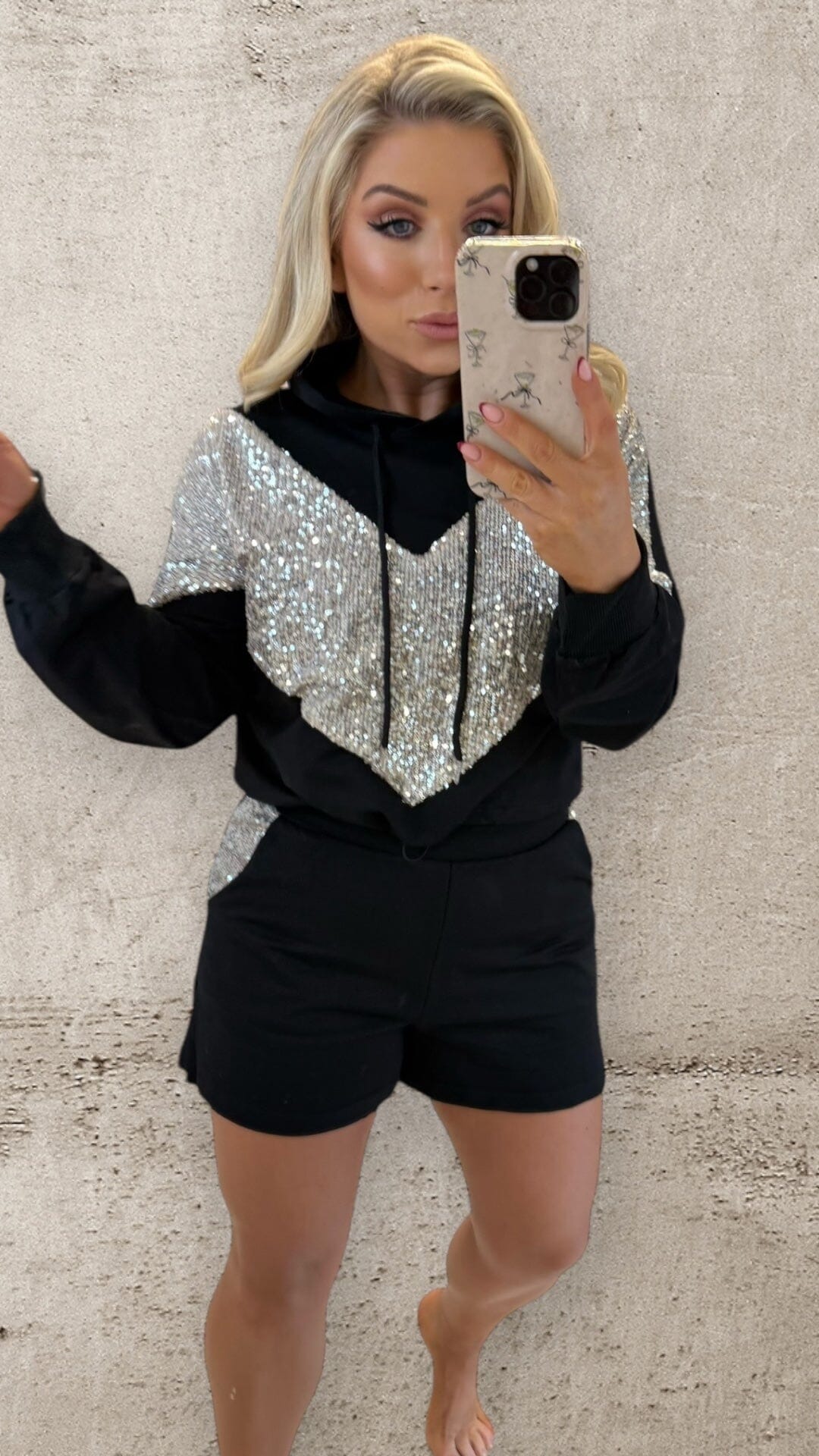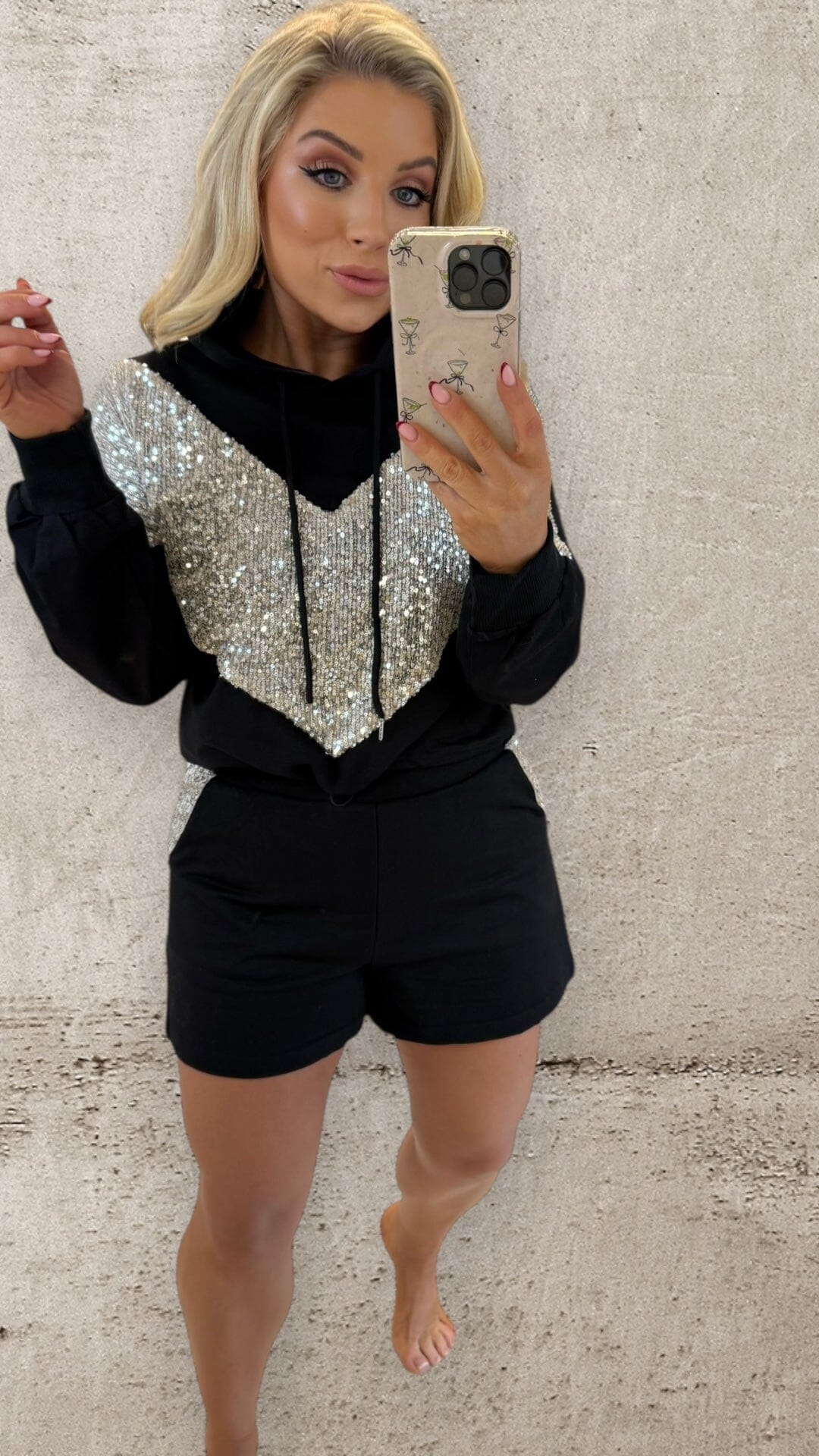 The hooded sweatshirt features a relaxed, easy fit, while the matching shorts are finished with practical pockets — perfect for lounging, travelling, or off-duty days when comfort is key. The touch of sparkle elevates this set, making it feel just that little bit more special.