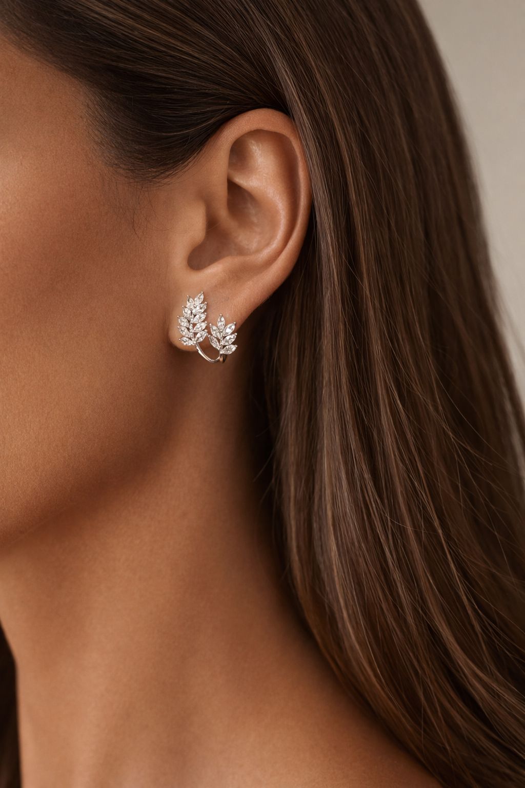 |Delicately sculpted in a graceful leaf silhouette, The Aurelia Leaf Earrings are adorned with shimmering Austrian crystals that catch the light with every movement. Designed to hug the ear elegantly, these statement studs bring just the right balance of sparkle and sophistication.