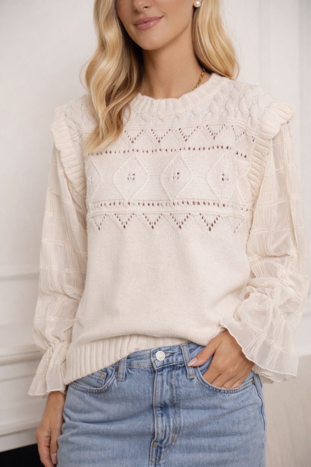 Meet The Celestine Knit — your new spring layering hero with a beautifully feminine twist. Crafted in a soft, lightweight knit, this elevated essential features intricate pointelle detailing through the body, delicate frill shoulders, and sheer textured balloon sleeves that instantly upgrade even the simplest denim days.