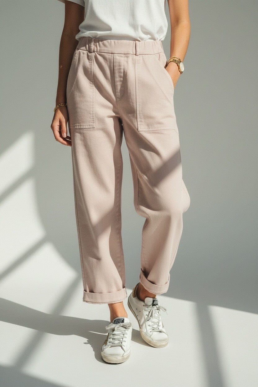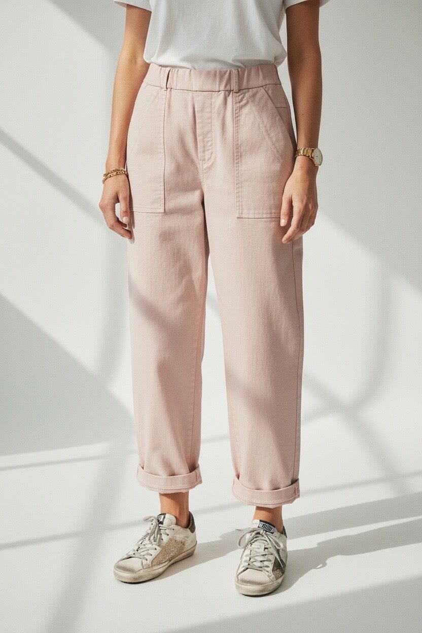 Meet your new everyday essential: The Elara Rose Utility Joggers. Designed in a soft rose powder hue, these beautifully cut joggers are crafted from a breathable cotton blend with just the right amount of stretch for all-day comfort.