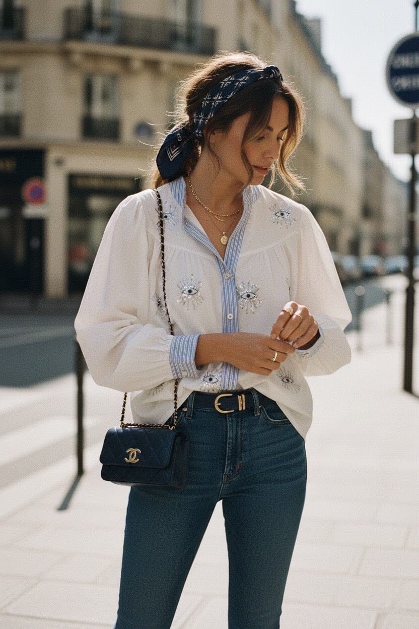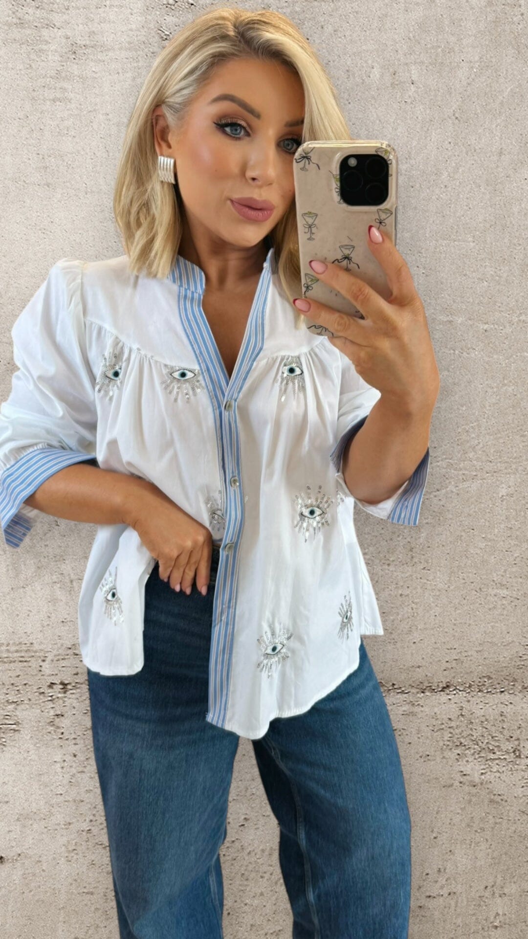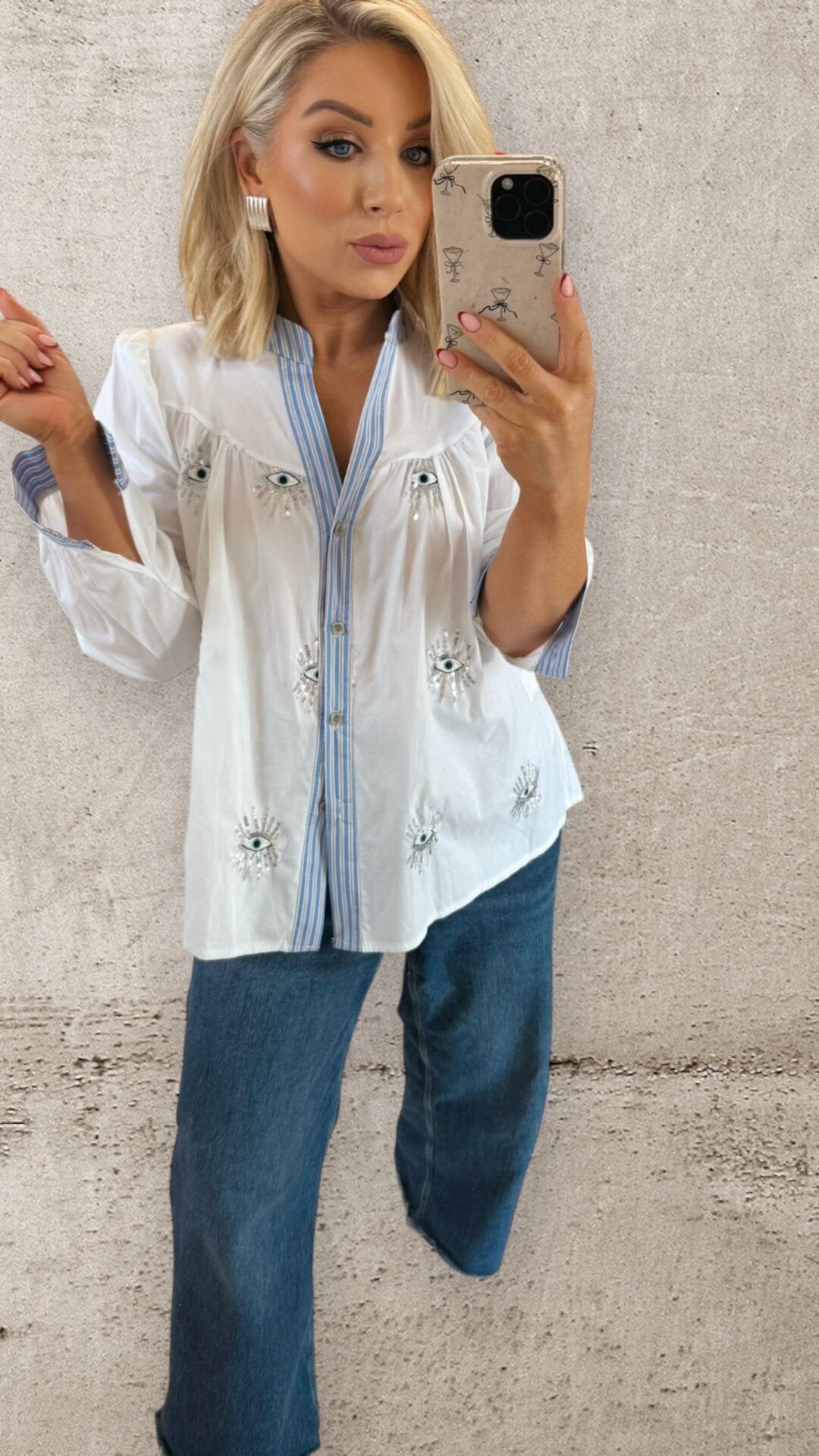 Designed to feel effortlessly polished yet playful, this shirt blends everyday tailoring with a hint of sparkle and symbolism. The evil eye detail adds personality and charm, making it perfect for those who love classic pieces with a unique twist.