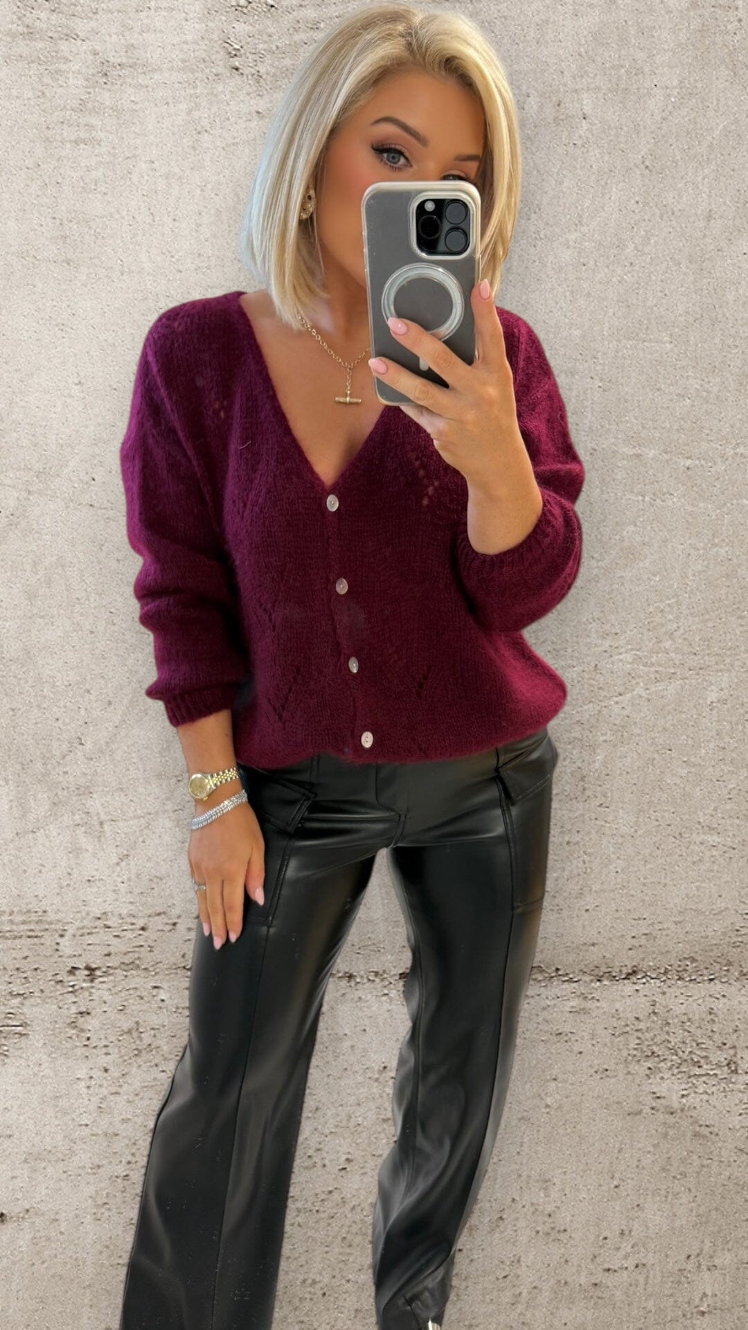 |Meet The Opal Knit — a luxurious mohair-blend cardigan in the rich shade of Merlot . Lightweight yet cosy, this beautifully textured knit features delicate pointelle stitching, relaxed sleeves and elegant pearl-style buttons for an effortlessly polished finish. The kind of piece that feels just as chic styled casually as it does dressed up — a forever wardrobe staple for A/W and beyond.
