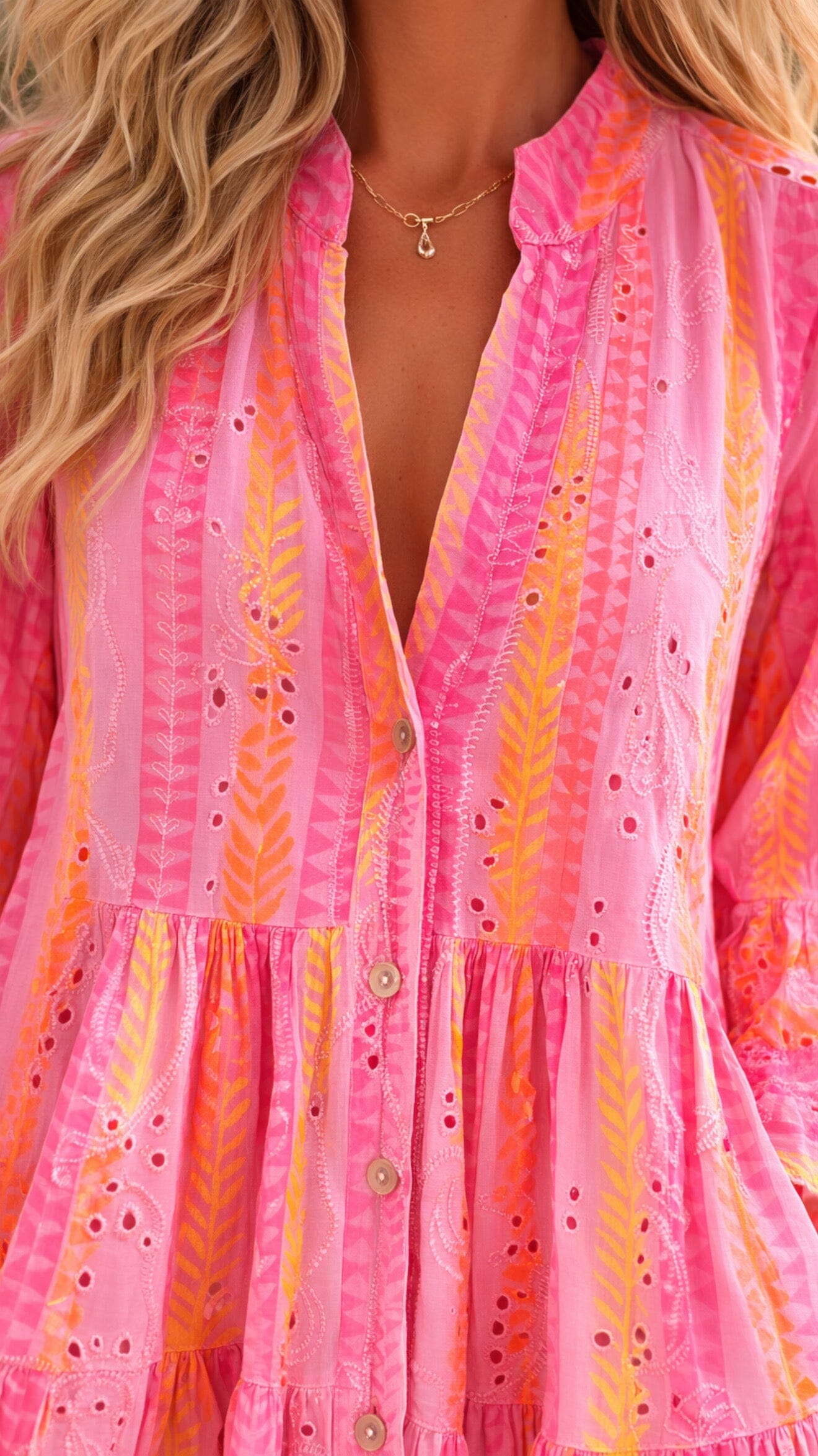 Crafted from 100% ultra-soft cotton broderie, this dreamy swing dress features a stunning neon pink, neon coral and baby pink colour-way that instantly elevates your holiday wardrobe. The intricate broderie detailing and subtle embroidery give it that luxe, elevated finish, while the flattering button-front design adds effortless polish.