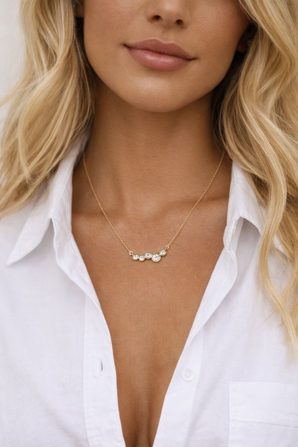 |This elegant necklace indulges your desire for sparkle and unique style. Whether worn alone or layered, its multi-crystal gold design adds a luxurious touch to any outfit. Elevate your look with this tasteful and exclusive piece.