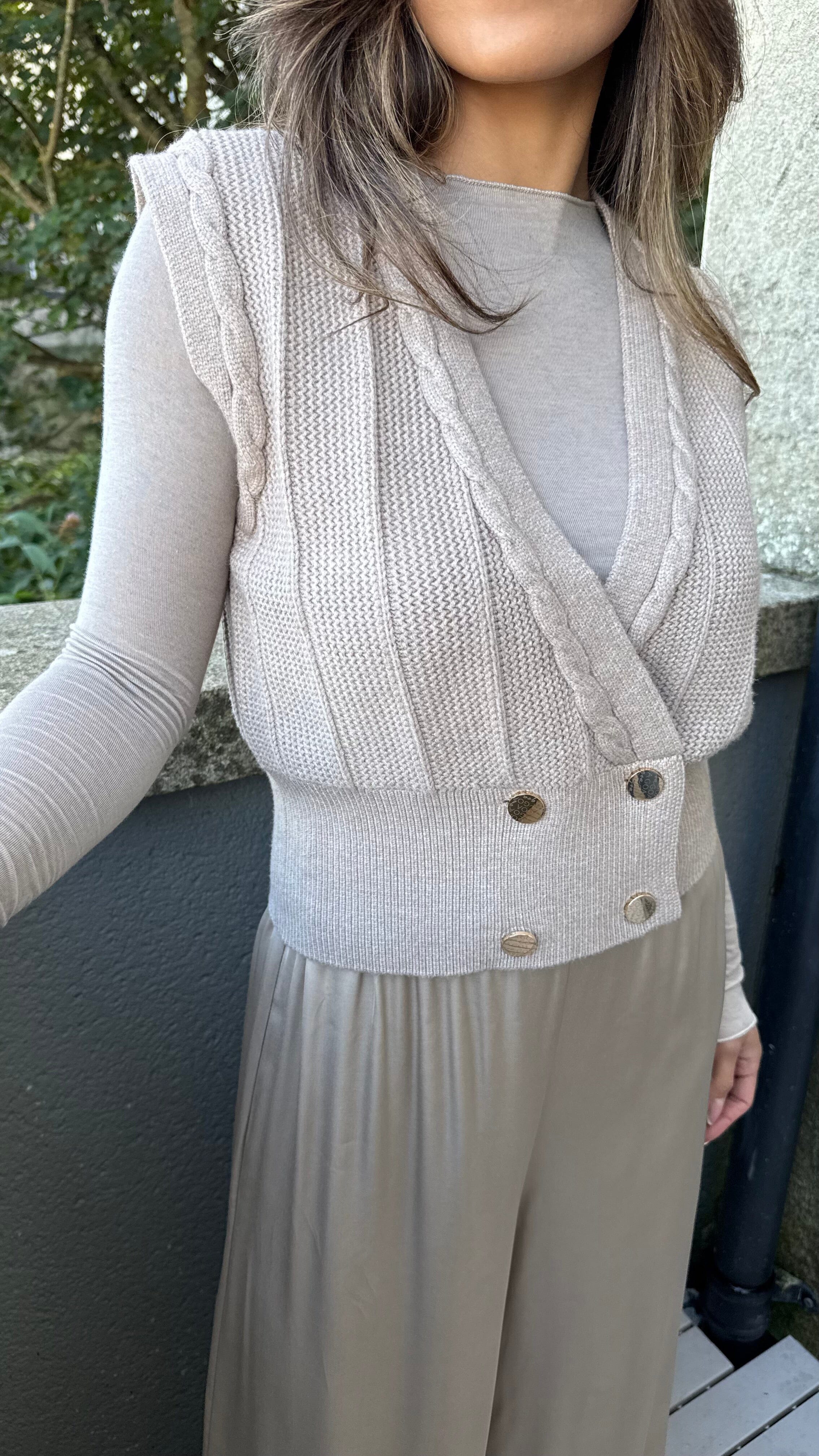 Chic, versatile, and right on trend — The Aurelia Vest is the statement knit you’ll wear on repeat. Designed in a luxury beigey-taupe shade, it features a textured knit with elegant gold-tone button detail and a subtle brand logo accent on the front.