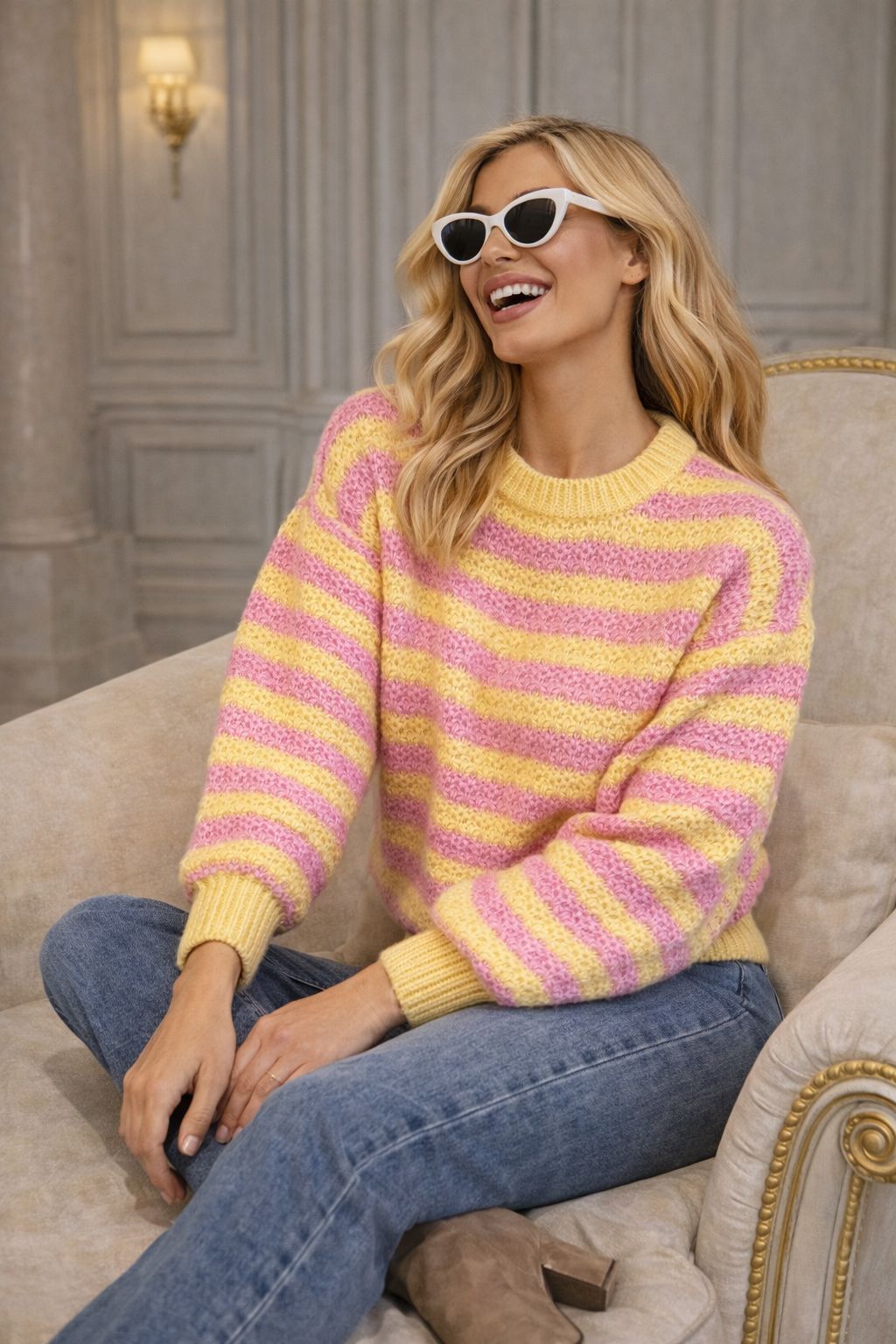 |Brighten your everyday wardrobe with The Soleil Stripe Knit — a feel-good jumper bursting with sunny yellow and soft pink tones. Crafted in a beautifully fluffy knit with a relaxed silhouette, this piece is perfect for effortless off-duty styling while still looking totally put-together.