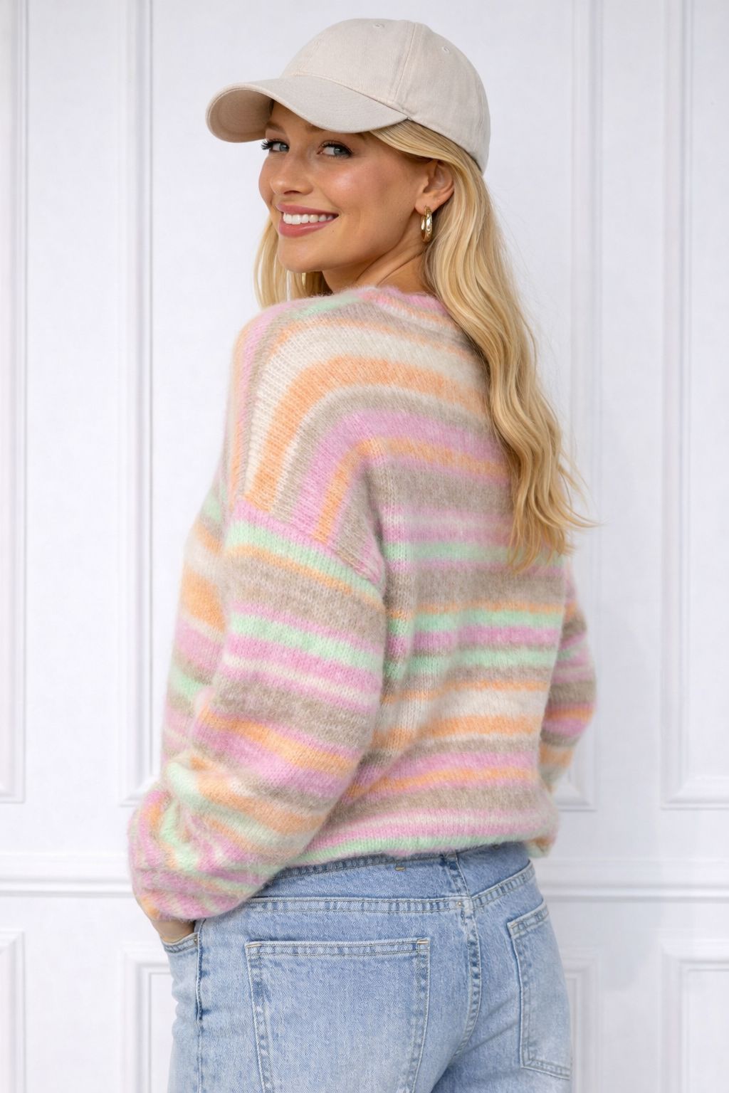 |Wrap yourself in effortless softness with The Pastel Muse Knit — a dreamy taupe base infused with delicate pastel stripes of blush pink, mint, and soft apricot. Designed in an ultra-soft, fluffy-touch knit, this piece feels as luxurious as it looks.