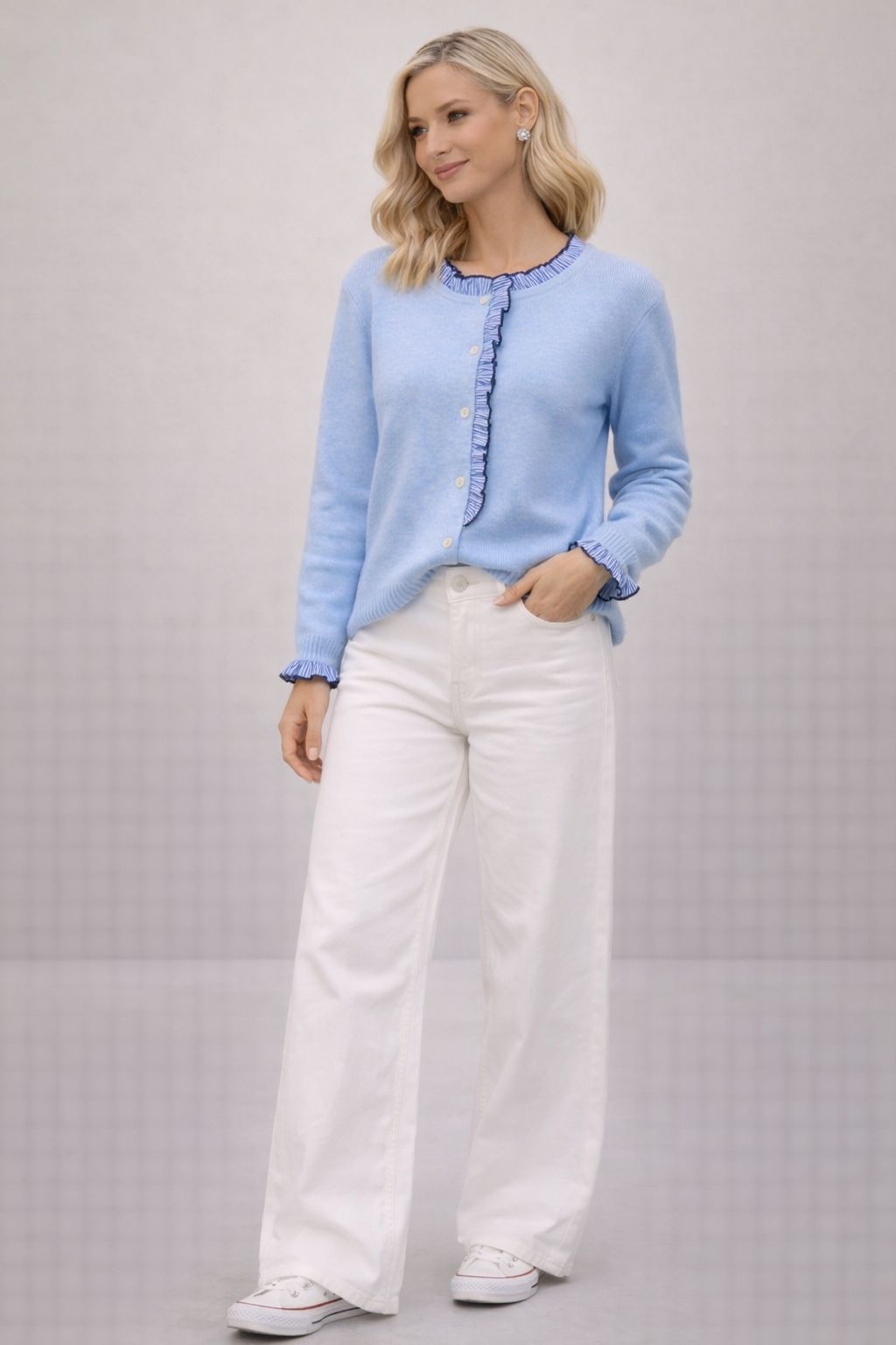 |Chic, soft and effortlessly feminine, The Belle Bleu Ruffle Cardigan is the perfect layering piece for year-round wear. Crafted in a beautiful soft blue knit, it features delicate striped ruffle trim along the neckline, button placket and cuffs for an elevated, Parisian-inspired finish.