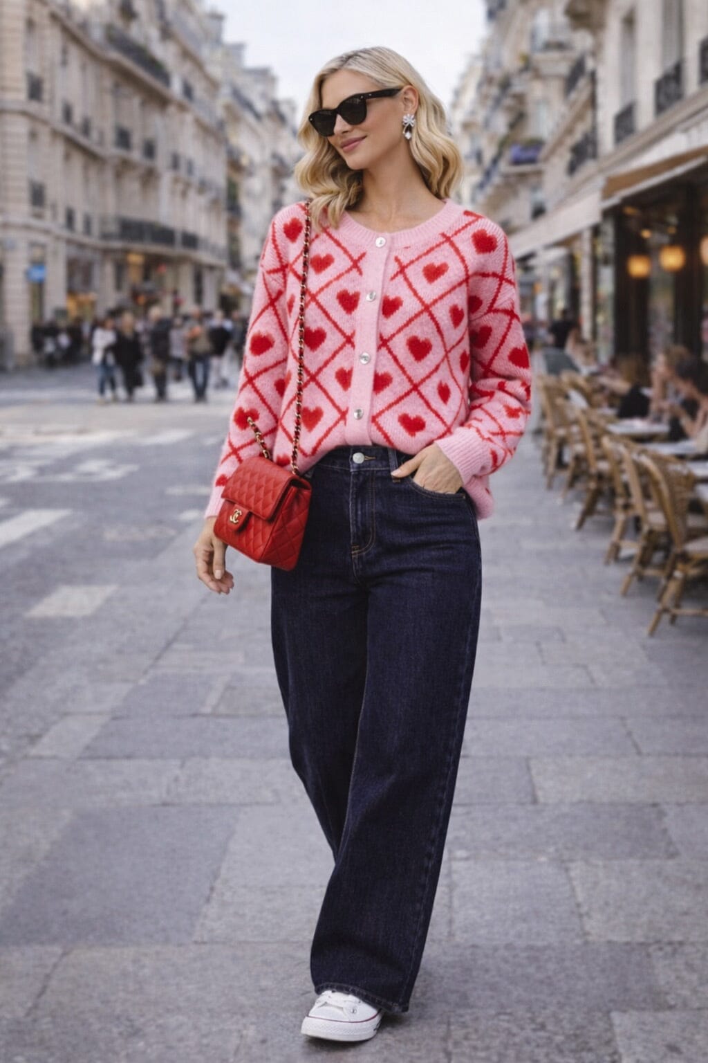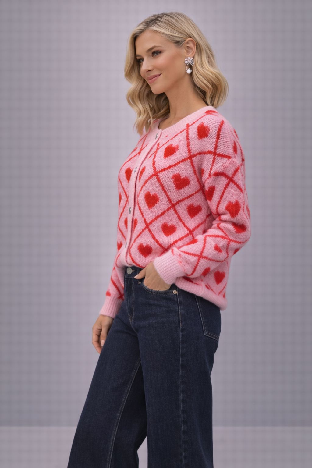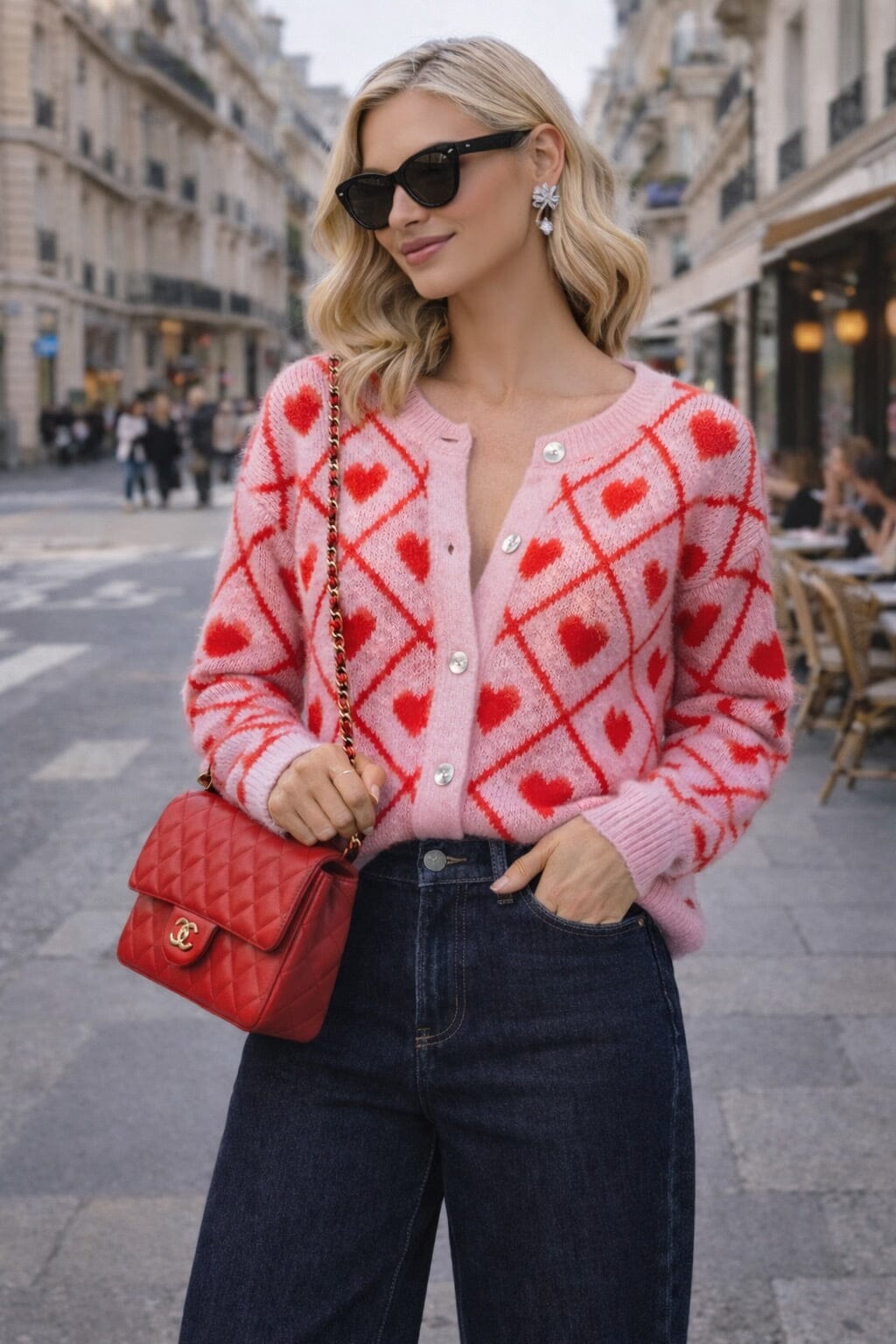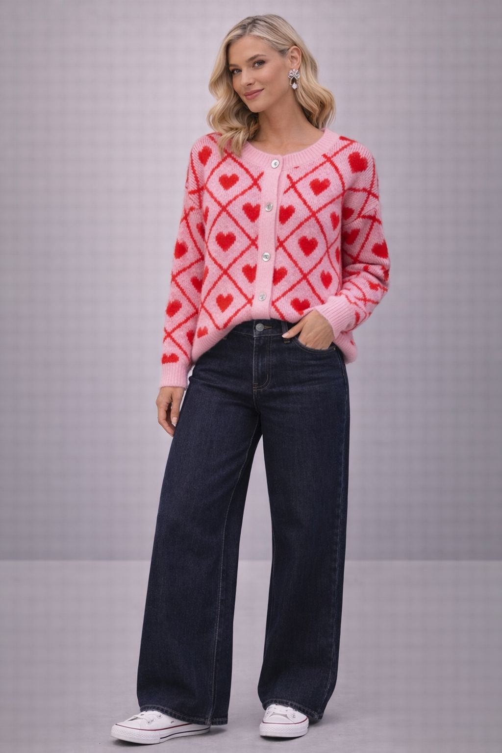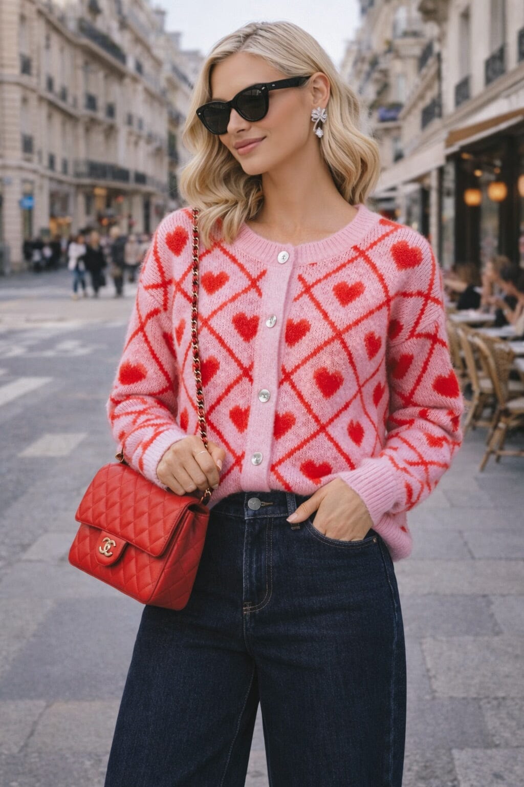 Fall head over heels for The Cosy Heart Cardigan — a beautifully soft knit designed to bring instant joy to your wardrobe. Featuring an eye-catching pink base with bold red heart motifs woven into a chic diamond pattern, this cardigan is the perfect blend of playful romance and effortless style.