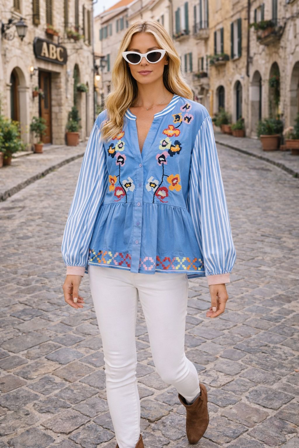 Featuring vibrant floral embroidery across the front and a charming geometric border along the hem, this lightweight shirt instantly elevates simple shorts or denim. The contrast striped sleeves add a playful, boutique-worthy twist, while the softly gathered waist creates a flattering, floaty silhouette that skims the body beautifully.