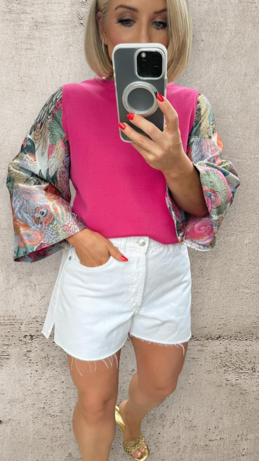 |Elevate your wardrobe with the Bellissima Sweater, a chic blend of bold colour and timeless elegance. Featuring a vibrant fuchsia pink body and luxuriously embroidered statement sleeves, this jumper is the perfect balance of comfort and sophistication.