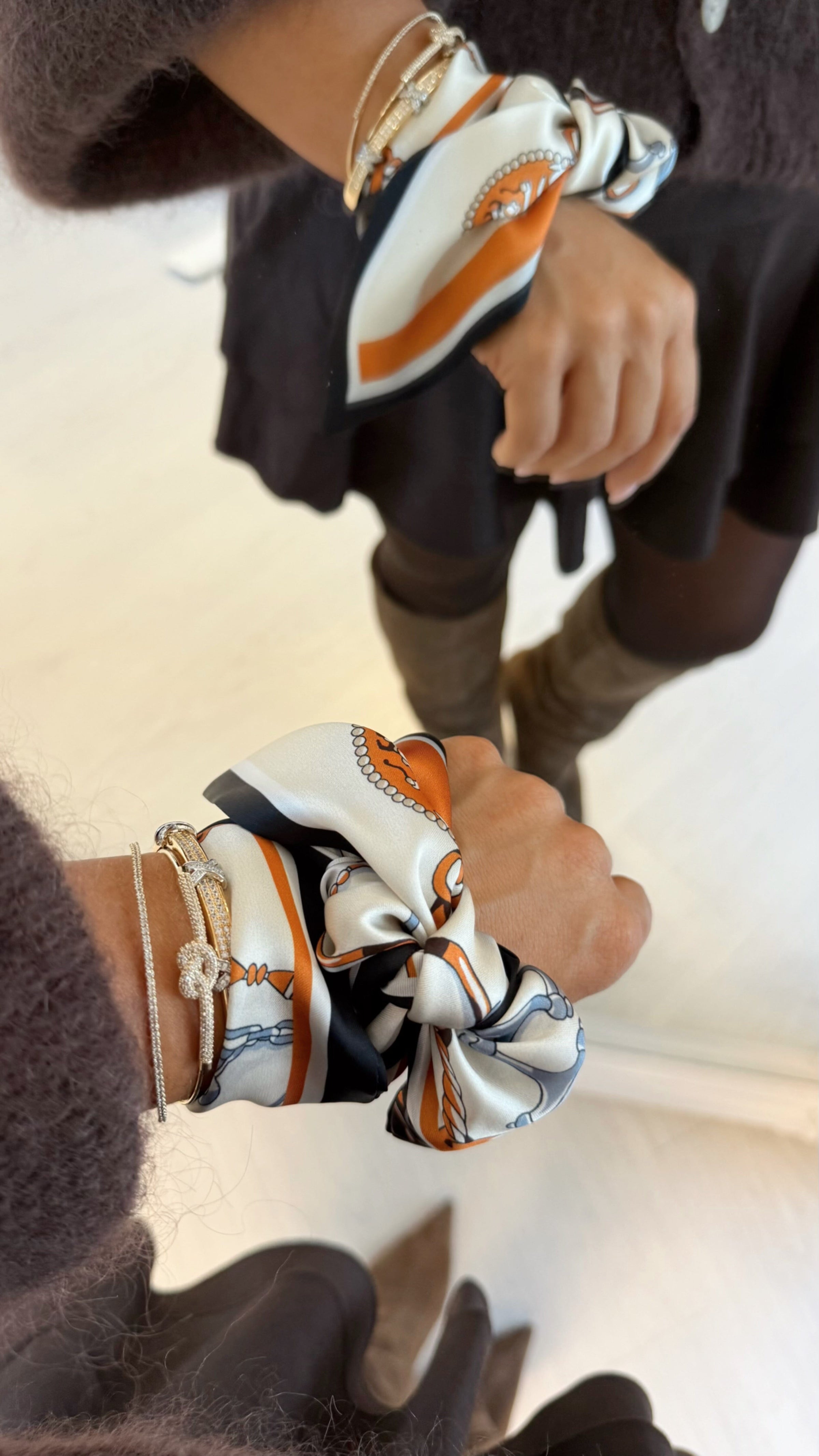 Add a touch of timeless elegance to your look with The Monaco Scarf — a silky, designer-inspired accessory that instantly elevates any outfit. Featuring a stunning equestrian chain and medallion print in shades of ivory, caramel, and soft grey, bordered with black for definition, this piece channels pure Parisian chic.